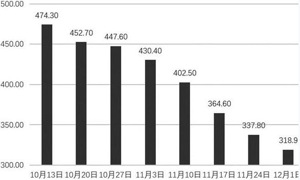 此外,限產(chǎn)存在地區(qū)的不均衡。冬季主要限產(chǎn)地區(qū)在螺紋鋼的主要產(chǎn)區(qū)——華北,但此時的北方正處于冬季,無論工地是否限停,基本都處于停工狀態(tài),因此限產(chǎn)對北方地區(qū)的需求影響不大。但在受限較少的南方,由于天氣溫暖,施工并未受到太大影響,需求減少不明顯。盡管如此,環(huán)保限產(chǎn)政策還是對需求有一定的抑制,鋼廠近期的產(chǎn)量數(shù)據(jù)還在下降,表明需求端并不樂觀。據(jù)中鋼協(xié)統(tǒng)計,10月全國重點鋼企粗鋼日均產(chǎn)量183.44萬噸,較上月下降1.9%。11月中旬重點鋼企粗鋼日均產(chǎn)量177.18萬噸,旬環(huán)比減少2.99萬噸,降幅1.66%。螺紋鋼現(xiàn)貨出貨節(jié)奏已經(jīng)開始減緩,從成交表現(xiàn)來看,終端采購積極性不高,市場出貨表現(xiàn)一般,這暗示著鋼廠的補庫差不多要完成。如果需求回落導(dǎo)致庫存下降趨勢扭轉(zhuǎn),加上期現(xiàn)價格均突破年內(nèi)高位,市場心態(tài)可能出現(xiàn)轉(zhuǎn)變。