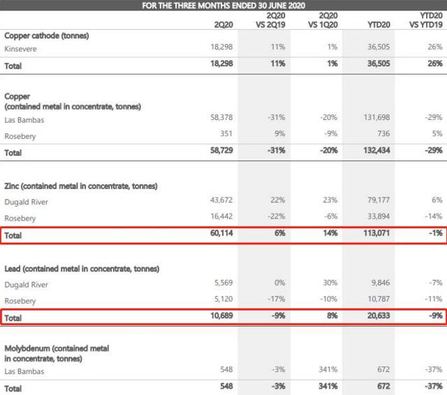 近日,MMG發(fā)布第二季度財(cái)報(bào)。在本報(bào)告期內(nèi),二季度鋅精礦產(chǎn)量為6.01萬(wàn)噸,同比增長(zhǎng)6%;鉛精礦產(chǎn)量為1.07萬(wàn)噸,同比下降9%。2020年上半年鋅精礦產(chǎn)量為11.3萬(wàn)噸,同比下降1%;鉛精礦產(chǎn)量為2.06萬(wàn)噸,同比下降9%。