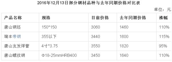 如若說(shuō)金三銀四是意料之中的話,那十一二月淡季的強(qiáng)勢(shì)逆襲絕對(duì)是出乎意料之外的。就在上半年鋼市大起大落后,大家對(duì)下半年沒有更多的期望,特別是經(jīng)歷了金九市場(chǎng)的弱勢(shì)下跌后,部分商家認(rèn)為今年的行情可能差不多就這樣了,后期不會(huì)有大波瀾。誰(shuí)也沒曾想到十一二月行情會(huì)如此迅猛,一路高歌。分析原因來(lái)看,期貨的強(qiáng)勢(shì)拉漲以及環(huán)保執(zhí)行力度的加大是十一二月行情拉漲的主要推動(dòng)因素,特別是近期的酸洗扎線限產(chǎn),中頻爐停產(chǎn)等環(huán)保消息一波高于一波,推動(dòng)鋼價(jià)走高。目前唐山鋼坯已經(jīng)攀上3000元/噸,較去年同期漲幅已超100%,也就是說(shuō)目前價(jià)格已經(jīng)是去年的一倍多(具體如下表)。然而目前來(lái)看鋼市拉漲的小馬達(dá)似乎仍沒有停止的意思,有意繼續(xù)創(chuàng)新。到底后期走勢(shì)如何,為您一一分析。
