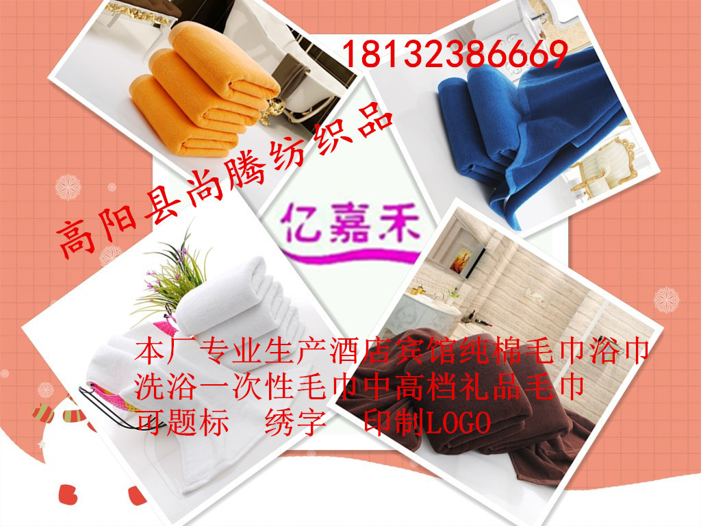 本廠專業(yè)生產(chǎn)酒店賓館專用21股國產(chǎn)棉、21股進口棉、32股進口棉毛巾,浴巾,方巾,地巾,可繡字,題標,印制LOGO。量大可來樣定織,定染。如有需要可隨時聯(lián)系——18132386669聯(lián)系人:于女士