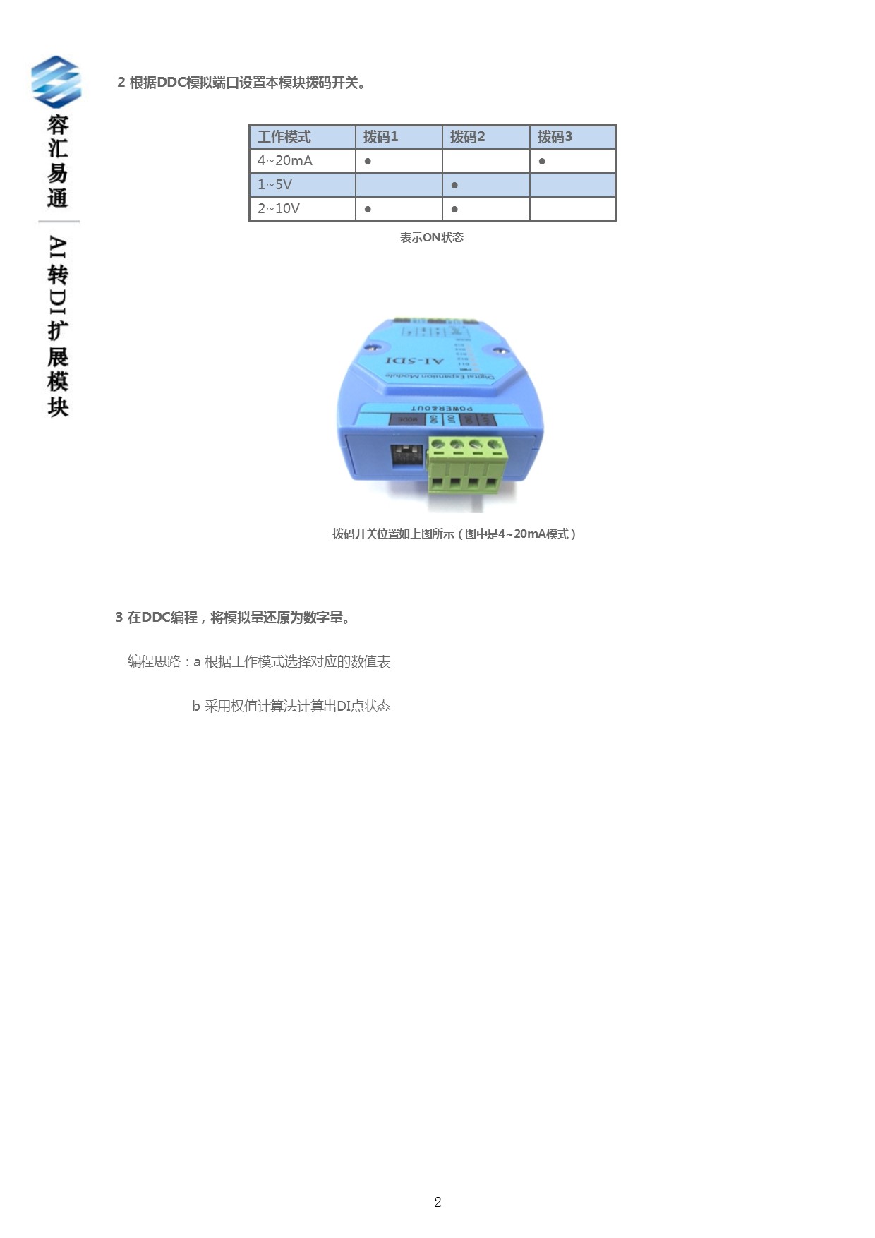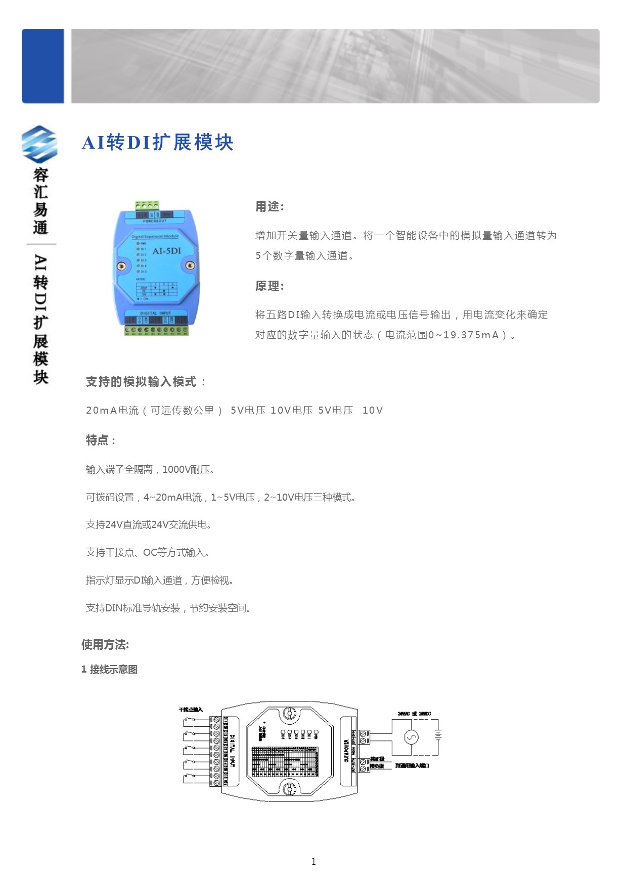 用途: 增加開關量輸入通道。將一個智能設備中的模擬量輸入通道轉為5個數字量輸入通道。