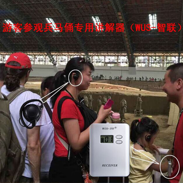 整套無(wú)線導(dǎo)游系統(tǒng)由一個(gè)數(shù)字無(wú)線發(fā)射器(或多個(gè)發(fā)射器)及多個(gè)數(shù)字接收器組成,講解發(fā)射器由現(xiàn)場(chǎng)講解員攜帶,來(lái)訪客人每人使用一只接收器及與之配套的耳機(jī)來(lái)收聽。接收器的數(shù)量可以達(dá)到上百個(gè),參考使用半徑約200米。同一場(chǎng)合可以容納32組接待團(tuán)體同時(shí)使用,組與組之間不會(huì)有任何干擾。還可以輸入mp3語(yǔ)音發(fā)射,接收端可以手動(dòng)置換信道和鎖定信道功能,可以很靈活的編組使用。