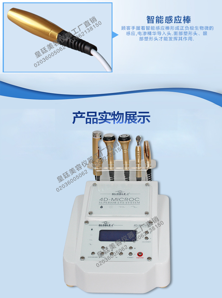 顧客手握著智能感應(yīng)棒形成正負(fù)極生物微的感應(yīng),電滲精華導(dǎo)入頭.面部塑形頭、眼部塑形頭才能發(fā)揮其作用.