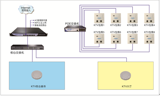方案組成:機(jī)房前端采用ac認(rèn)證路由器,集成ac管理、wifi認(rèn)證、智能流控等功能。全千兆核心交換機(jī),樓層采用poe交換機(jī)通過網(wǎng)線供電及數(shù)據(jù)傳輸?shù)絢tv包房入墻式ap,大廳及前臺接待采用吸頂ap,覆蓋范圍大,維護(hù)方便,統(tǒng)一由前端ac認(rèn)證路由器管理。