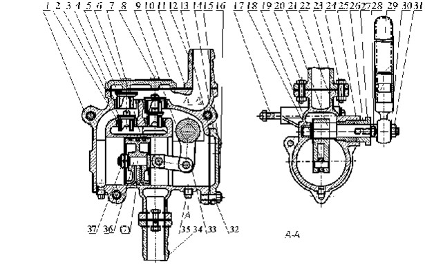 S、SH-25、38型手搖泵的結(jié)構(gòu)原理是,當(dāng)用手往復(fù)搖動(dòng)搖手柄(29)時(shí),通過(guò)軸(21)、搖臂(9)、連桿(36)等傳動(dòng)機(jī)構(gòu),使活塞(7)作往復(fù)運(yùn)動(dòng)。如圖所示,當(dāng)活塞向左移動(dòng)時(shí),右端的泵缸體積逐漸擴(kuò)大,形成真空,液體從吸水管(34)經(jīng)過(guò)鑄在泵體旁邊的吸入流道頂開(kāi)吸水閥進(jìn)入缸體右端。在同一時(shí)間里,缸體左側(cè)由于活塞的壓縮,使壓水閥(5)頂開(kāi),液體經(jīng)吐出管(11)排出。若活塞的運(yùn)動(dòng)方向返回向右時(shí),則泵缸左側(cè)吸入液體,泵缸右側(cè)排出液體,這樣往復(fù)不歇地把液體吸入排出。形成泵的工作。泵的壓水閥向上行程由蓋板(6)限止,吸水閥向上行程由壓水閥限止。蓋板與泵體用螺栓(8)緊固,活塞行程由泵蓋(14)和泵體限止。