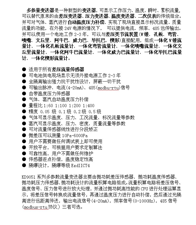 microsoftinternetexplorer402documentnotspecified7.8 磅normal0差壓流量計占有流量儀表的市場的比例是非常之大的。市場中應用比較多的是孔板、噴嘴、文丘里、彎管、阿牛巴、威力巴、楔型、v錐等流量計。差壓流量計有很多的優(yōu)點,機構(gòu)簡單,長期穩(wěn)定、抗干擾性好、抗震動能力強等。但是也有許多的缺點。主要就是使用起來比較麻煩,安裝麻煩、一般都是按裝差壓變送器,然后配二次儀表或者計算機等。必然就造成了用戶使用麻煩,容易出錯,操作難度增加。成本也必然的增加。一般輸出是電流,沒辦法做到每個表實流標定。國內(nèi)沒有一家做到每臺差壓流量儀表出廠前進行標定。都是靠計算來實現(xiàn)。必然造成理論和實際有一些出入,而帶來誤差。還有一個重要的缺點就是不能電池自供電,實現(xiàn)微功耗。因為好多地方是無法提供電源的。針對這些情況,上?隙甲詣踊瘍x表有限公司研發(fā)了一個微功耗電池供電的差壓流量多參量變送器。流量和差壓傳感器一體化設計,直接顯示流量信號,可以不接電源的情況下進行流量的計量。全隔離的脈沖輸出,可以直接在標定臺子上實流標定,把系數(shù)反饋到多參量變送器。大大提高儀表的實際準確性。擺脫了差壓流量計靠計算的這個操作辦法。