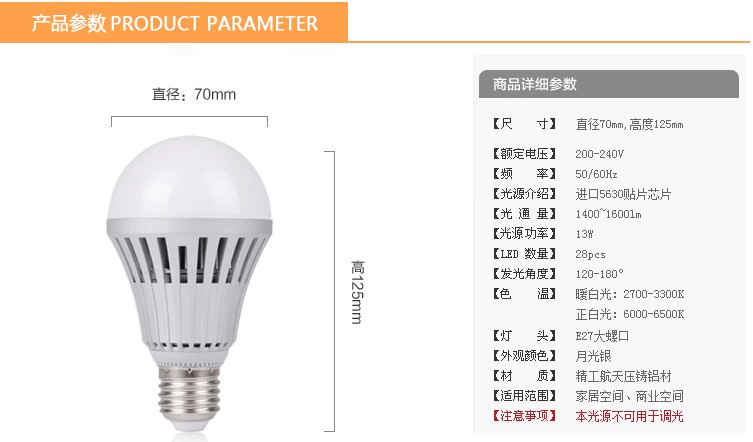 2、使用led固體光源,沒有玻殼、鎢絲等易損部件,經(jīng)得起震動沖擊,采用普通e27常用接口,可直接裝在常用交流86v至265v接口上,使用方便、安全。