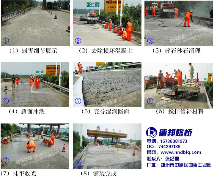 德邦路橋工程(河南)有限公司是國內(nèi)唯一能夠系統(tǒng)解決水泥混凝土路面表層、深層各種結(jié)構(gòu)類病害的專業(yè)公司。我們的修補材料對于橋梁伸縮縫、橋梁鋪裝層的修復,能夠做到1小時恢復通車!為二十余省的高速、國道、省道、縣鄉(xiāng)道路、市政工程改造及養(yǎng)護提供了系統(tǒng)的解決方案和優(yōu)質(zhì)的產(chǎn)品服務。2016年德邦路橋成為多省“國家道路迎國檢指定品牌”,確立了行業(yè)龍頭地位!