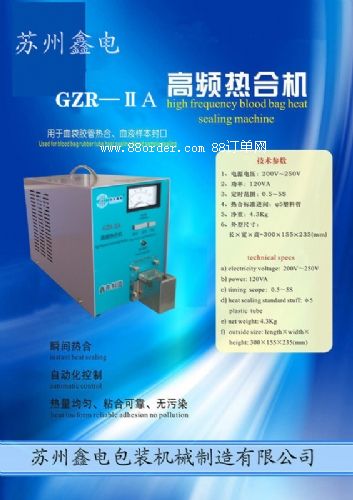液、血制品及生理鹽水。為滿足這些專用塑料袋封口的特殊要求, 我廠研制、生產(chǎn)了gzr系列自動高頻熱合機。該產(chǎn)品是根據(jù)聚氯乙烯管道在高頻電場作用下產(chǎn)生極化而發(fā)熱粘合的原理來設計的,具有無污染、不破壞液體的質量、封口可靠不滲漏等優(yōu)點。進口繼電器的采用,提高了可靠了性;熱合頭的改良設計,使封口冷卻后,不用剪刀可以隨時拉開。