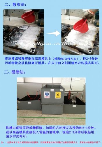 2、浸漬法:鐵槽內(nèi)盛裝原液或稀釋液,加溫到100℃左右浸漬2-3分鐘。或?qū)⒛>呒訙氐?5℃以上,直接投入洗模水溶液中,浸泡2-5分鐘左右,可見污垢溶解后取起,再用清水沖洗即可。