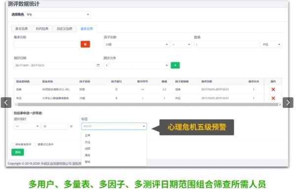 系統(tǒng)精選心理健康常用評估量表工具15大類,輔助調(diào)查問卷系統(tǒng),常模自動更新,實現(xiàn)心理行為問題篩查、心理危機即時預(yù)警、心理測評檔案和全員心理健康水平綜合分析報告一鍵生成,科學(xué)高效管理社會全員心理健康。