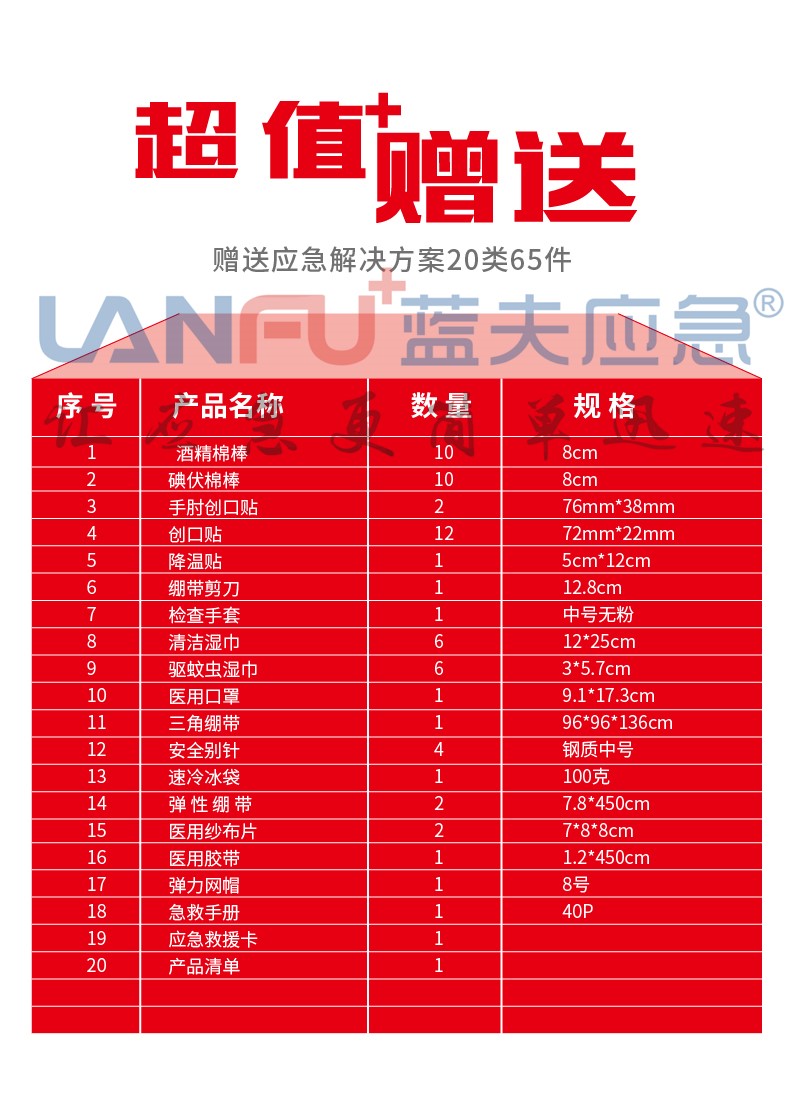 主要功能:消毒清創(chuàng)、傷口包扎、防護(hù)隔離、冷敷降溫等以及其他應(yīng)急器具。