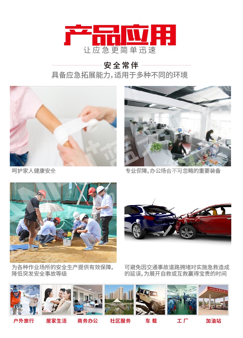 使用場(chǎng)景:旅游|戶外背包攜帶,戶外作業(yè)應(yīng)急單品,家用環(huán)境及辦公環(huán)境應(yīng)急,車載應(yīng)急包,福利|禮品發(fā)放等