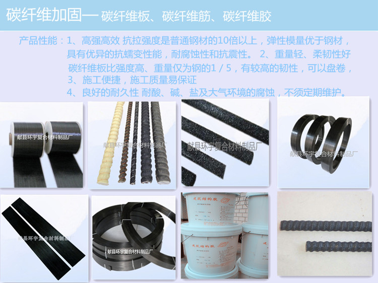 我廠專(zhuān)業(yè)生產(chǎn)銷(xiāo)售建筑加固、補(bǔ)強(qiáng)用碳纖維布、碳纖維板,碳纖維膠,以上產(chǎn)品超過(guò)國(guó)家中建材(混凝土結(jié)構(gòu)加固)檢測(cè)標(biāo)準(zhǔn),可與國(guó)外進(jìn)口材料比美,已在全國(guó)各地加固中正常使用,其中碳纖維布、板已出口到美國(guó)、德國(guó)、新加坡、土而其等國(guó)家。穩(wěn)定的產(chǎn)品質(zhì)量,低廉的價(jià)位,優(yōu)良服務(wù),深受海內(nèi)外使用商好評(píng);在此環(huán)宇復(fù)合材料制品廠全體員工歡迎更多的海內(nèi)外新老客戶的光臨與合作。