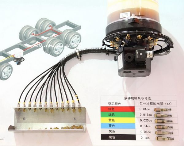 potentlube ac系列的設(shè)計(jì)能夠在最苛刻的應(yīng)用條件下,提供可靠的服務(wù),實(shí)現(xiàn)真正的免維護(hù)。系統(tǒng)包括一臺 12/24v 電動泵(配備整體式控制器)和一束管線,管線直接將各個底盤軸承連接至其對應(yīng)的泵芯。每個軸承獨(dú)立給油,意味著可以單獨(dú)校準(zhǔn)各潤滑點(diǎn),而且一條管線損壞不會影響系統(tǒng)的其他管線。泵有兩種型號:ac1 和 ac2分別有1 升和 2 升頂部加油的油箱,它們的電動機(jī)和控制器上覆蓋著頂蓋;ac3有一個 3 升油箱,電動機(jī)和控制器罩在底部。電動機(jī)轉(zhuǎn)動驅(qū)動軸和槳板,槳板將潤滑脂推入增壓室。這確保了潤滑油量進(jìn)入泵芯,泵的運(yùn)行也直觀可見。它還驅(qū)動凸輪,凸輪操控各個泵芯,將潤滑脂送入管道。從sae 80潤滑油到 nlgi 2 級潤滑脂,泵可以使用廣泛多樣的潤滑劑。 油箱槳板(10)也由凸輪總成帶動旋轉(zhuǎn)。槳板(10)旋轉(zhuǎn)確保潤滑油量進(jìn)入泵芯。
