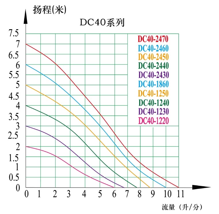 | 選型注意事項(xiàng) | 如果選用調(diào)速型號(hào)則在后面加上字母a,例如dc40-2470a。 選型時(shí)務(wù)必給出使用環(huán)境:如連續(xù)工作時(shí)間、水溫、介質(zhì)等,水泵功率超過24w就不適合長(zhǎng)期在60度以上水溫連續(xù)工作,請(qǐng)務(wù)必與專業(yè)人員溝通以便選擇最合適的水泵型號(hào)! 上述電流為水泵的開口電流即當(dāng)水泵直接放入水中不接任何系統(tǒng)時(shí)的電流,也為水泵最大電流,當(dāng)水泵接上系統(tǒng)之后水泵的工作電流會(huì)降低到最大負(fù)載電流的70%-85%。 水泵的揚(yáng)程為最大送水高度,即到達(dá)最大揚(yáng)程點(diǎn)的流量為零。 水泵的流量為水平流量,即水平抽水的流量。 | ||||