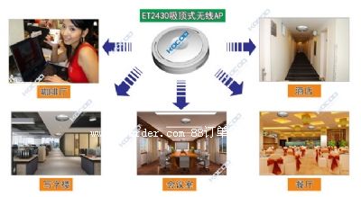 et2430大功率吸頂式無(wú)線ap,性能穩(wěn)定,信號(hào)覆蓋范圍廣,樓層設(shè)備少,能有效避免同頻干擾。施工簡(jiǎn)單快捷,美觀大方,對(duì)新裝酒店與改造酒店都很方便,不需要對(duì)客房原有線路做任何改變。超強(qiáng)性能,造價(jià)成本低,是目前酒店常用的無(wú)線覆蓋方案。