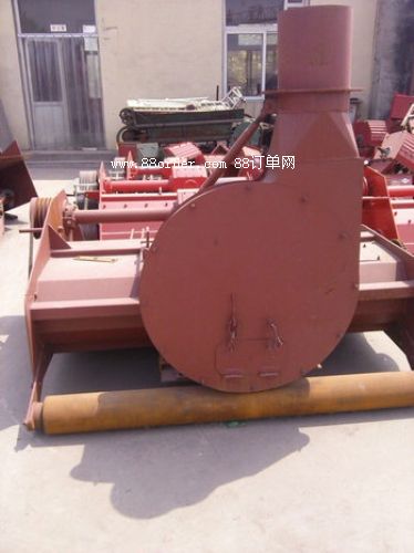 該機(jī)主要有懸掛部分、變速傳動部分、切斷揉搓粉碎部分、回收輸送部分、風(fēng)葉等組成。牽引動力經(jīng)萬向節(jié)傳至變速箱,使轉(zhuǎn)速按1:2.5提速,以保證切斷及風(fēng)送效果。秸稈經(jīng)高速旋轉(zhuǎn)的切斷粉碎部分粉碎后,經(jīng)螺旋輸送至風(fēng)葉部分吹送至隨機(jī)運(yùn)輸車。