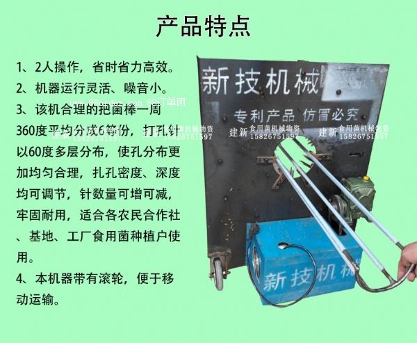 360度平均分成6等份,打孔針以60度多層分布,使孔分布更加均勻合理,扎孔密度、深度均可調(diào)節(jié),針數(shù)量可增可減,牢固耐用,適合各農(nóng)民合作社、基地、工廠食用菌種植戶使用。