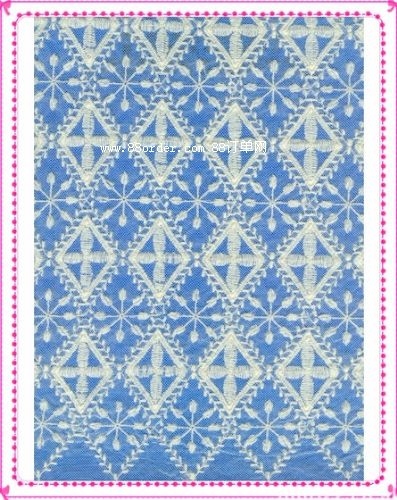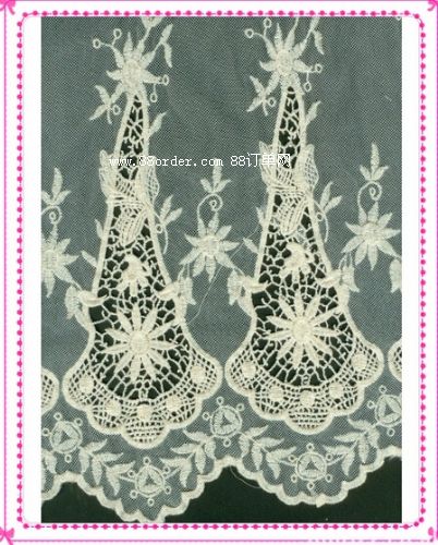 a棉線水溶面料、牛奶絲水溶面料、滌淪絲水溶面料、歐根紗刺繡面料、各種網(wǎng)布刺繡面料,棉布刺繡面料,及各種刺繡條花和朵花、馬甲、裙擺等花邊b睫毛蕾絲面料、錦棉蕾絲面料、錦氨蕾絲面料、全錦蕾絲面料、無彈蕾絲面料及各種有彈無彈蕾絲條邊花邊。c 棉線全棉花邊。