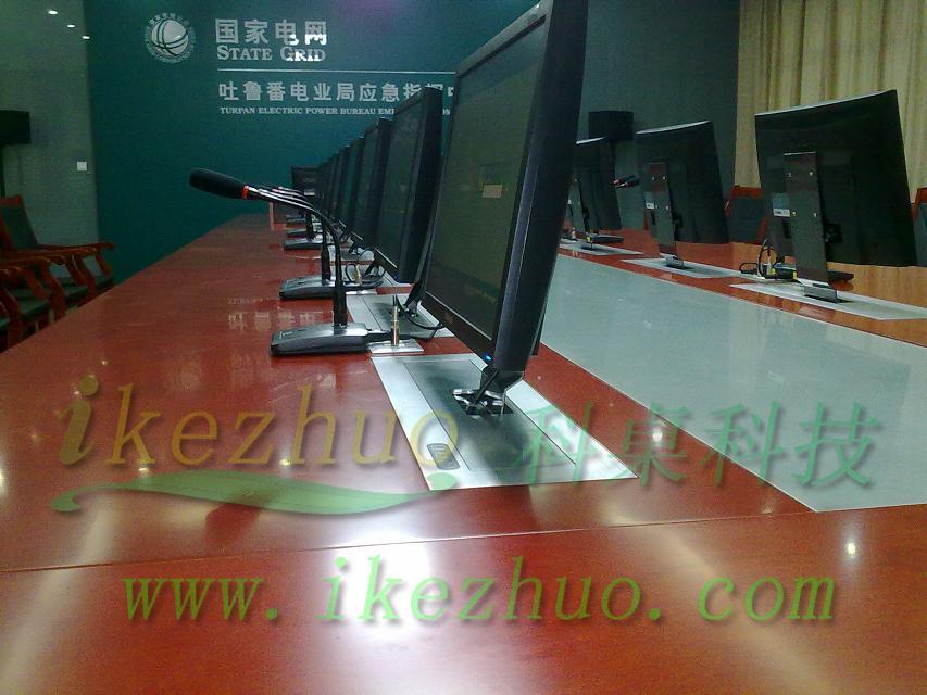 示器從會議桌下面升到桌面、當不使用顯示器時,升降機自動下降,顯示器隱藏在會議桌內(nèi),起到防塵,防盜,保持桌面
