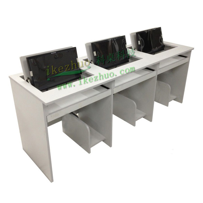 4、當(dāng)不使用顯示器時(shí),可手動(dòng)按下顯示器翻蓋面板至桌面平整,顯示器自動(dòng)鎖住隱藏在桌子內(nèi)部,此時(shí)整個(gè)桌面成一個(gè)平面狀態(tài)