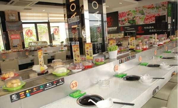 內(nèi)部采用白色防摩尼龍墊條,旋轉(zhuǎn)吧臺,壽司料理,旋轉(zhuǎn)火鍋,自助火鍋餐廳。