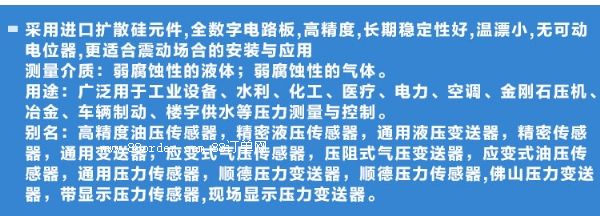 采用進(jìn)口擴(kuò)散硅元件,全數(shù)字電路板,高精度,長(zhǎng)期穩(wěn)定性好,溫漂小,無(wú)可動(dòng)電位器,更適合震動(dòng)場(chǎng)合的安裝與應(yīng)用