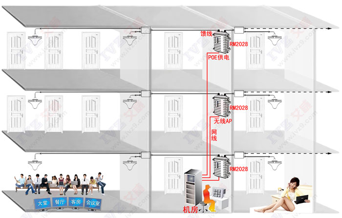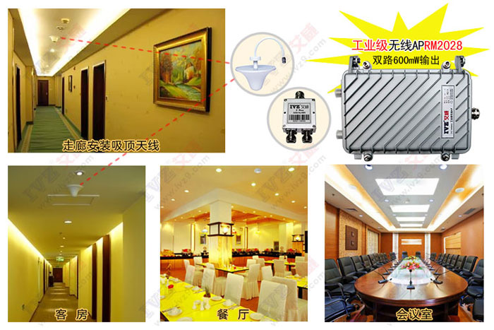艾威rm2028無線ap通過poe供電于機房相連,無線ap通過饋線連接吸頂天線安裝在走廊,每個天線相距10-15米,每個天線覆蓋4-6個房間,采用rm2028無線ap雙路輸出可接4-8個吸頂天線能覆蓋16-32個房間。