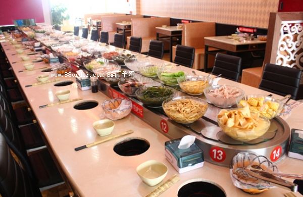 然后輸送帶就會帶著食材圍繞店鋪的座位循環(huán)回轉(zhuǎn)。工作人員站在原地就可以隨時補充新鮮的食材,而不用到處跑動,最大限度的減縮了人力資源成本的損耗。而消費者也不用再看哪些枯燥無味的菜單,