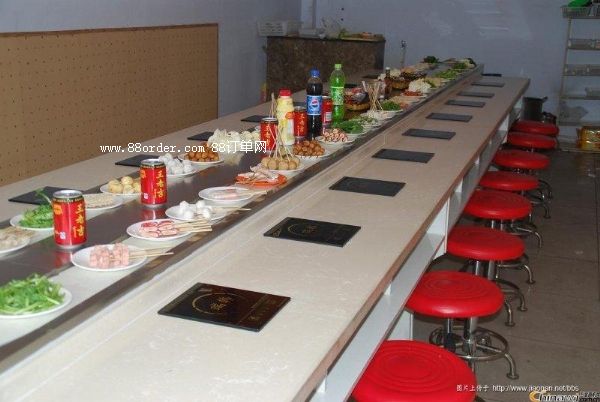 旋轉(zhuǎn)吧臺,壽司料理,旋轉(zhuǎn)火鍋,自助火鍋餐廳。下架采30mm*30mm*1.5的碳鋼方管焊接而成,表面經(jīng)過防銹處理,所有連接部分均采用標(biāo)準(zhǔn)件連接,便于移裝。