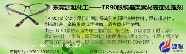 目前市場上,眼鏡框在選材方面也較為講究,大多數(shù)廠家都會選擇用一種叫做tr90的素材,其主要原因是因?yàn)檫@一種tr90素材是一種記憶性的高分子材料。其抗變形指數(shù)高,不易變形(可以自由折彎,具有可恢復(fù)性)。由于tr90素材表面物理性能較差,極性低,在噴漆加工中,涂料很難在材料上附著,需要對材料表面進(jìn)行處理(火焰、電暈)后才能有較好的附著。本公司經(jīng)過長時(shí)間研究,研發(fā)出一款針對tr90材料的噴漆前表面處理劑,對tr90素材層間附著非常好。本產(chǎn)品無鹵環(huán)保,廣泛應(yīng)用在眼鏡框、玩具配件、汽車配件裝飾件等領(lǐng)域,目前華東、華南涂料油墨公司大量使用,評價(jià)極高。