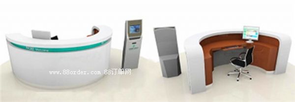 材質(zhì):白色人造石臺面,配農(nóng)行綠色亞克力裝飾邊,白色烤漆臺身,淺灰色免漆板內(nèi)鋪臺,拉絲不銹鋼底座