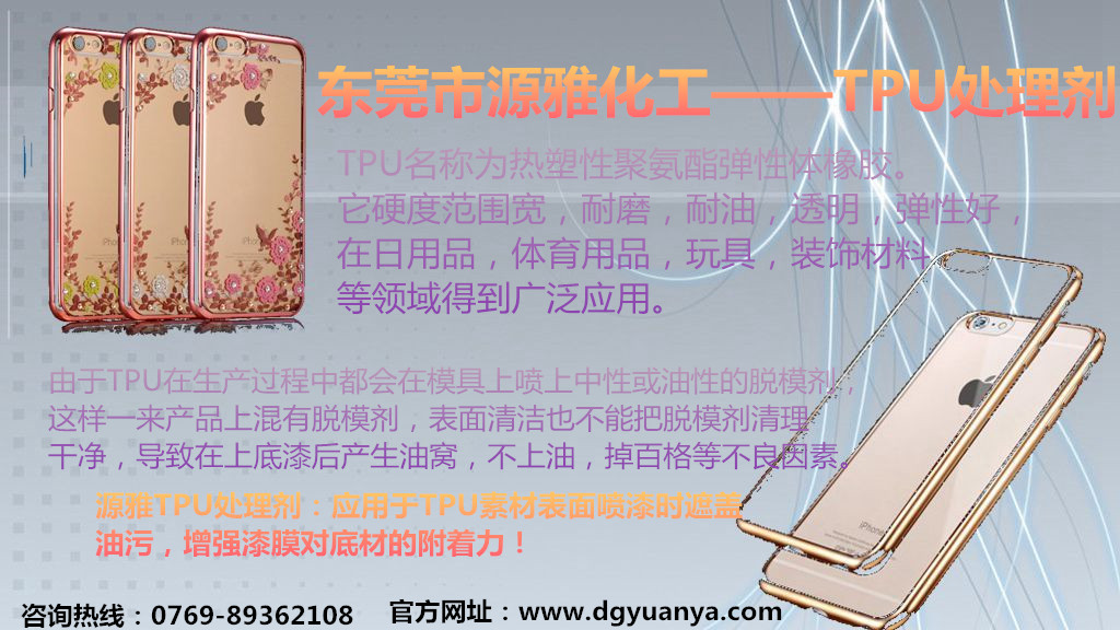 隨著iphone6s上市,市場上又掀起了一股手機(jī)保護(hù)套的熱潮,而tpu素材因?yàn)榫哂腥嵝浴⒍恍枰鏊軇;tpu還有良好的耐天候性,極優(yōu)的耐高能射線性能。眾所周知的耐磨性,抗撕裂性,屈擾強(qiáng)度都是優(yōu)良的;拉伸強(qiáng)度高,伸長率大,長期壓縮永久變形率低等都是tpu的顯著優(yōu)點(diǎn),從而大受大眾喜愛。但是在tpu保護(hù)殼生產(chǎn)過程中都會在模具上噴上中性或油性的脫模劑(離型劑),這樣一來在產(chǎn)品上就混有脫模劑,就算噴涂前表面清潔也不能把脫模劑清理干凈,導(dǎo)致在上uv底漆后起油窩,不上油,掉百格等不良因素。經(jīng)我公司分析成功研發(fā)了一款單組份快干型tpu油污處理劑,產(chǎn)品性能主要是遮蓋素材油污,提高生產(chǎn)良率,增強(qiáng)素材與油漆的附著力等。該產(chǎn)品已大量應(yīng)用于手機(jī)保護(hù)套tpu真空電鍍工藝上。