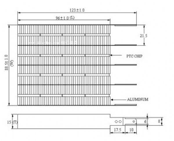 ptc波紋發(fā)熱器由精選優(yōu)質ptc熱敏陶瓷發(fā)熱組件為發(fā)熱源,采用波紋鋁條經高溫膠粘、焊、模壓組成。使用國家標準件耐高溫絕緣支架安裝,支架螺絲孔的孔距方便客戶組裝應用,超溫保險端子鏈接牢固,無脫落松動現(xiàn)象。