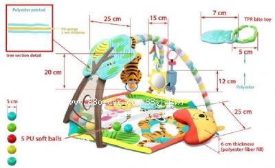 我司需要附件圖片款式的六邊形嬰兒運動游戲墊: 尺寸80*80cm(最大直徑) 動物頭尺寸25cm寬度厚度6cm(pp棉填充) 地墊結構上層滌綸布印花, 中間5mm厚epe, 底層滌綸布 兩個交叉活動掛架, 離地墊高度45cm 1側為樹干型網(wǎng)布帶圓洞, 樹干結構中間3mm厚epe, 外面包覆滌綸印花樹干花紋面料; 4個tpr吊環(huán), 兩個玩具,1個牙膠,1個鏡子 5個pu發(fā)泡軟球 包裝: 每套裝1個彩盒 彩盒尺寸: 50*70*12cm; 請專業(yè)出口生產(chǎn)企業(yè)聯(lián)系我司確認最低含稅寧波價格和訂單,我司企業(yè)qq