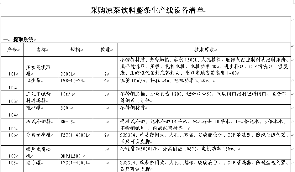 產(chǎn)品名稱:涼茶生產(chǎn)設(shè)備 采購(gòu)量:5套 產(chǎn)品描述:涼茶飲料全自動(dòng)生產(chǎn)流水線設(shè)備 收貨地: 浙江 杭州 杭州市 報(bào)價(jià)要求: 需要報(bào)含稅價(jià) 涼茶全自動(dòng)加工配套設(shè)備,請(qǐng)?zhí)峁﹥r(jià)格、設(shè)備名稱。